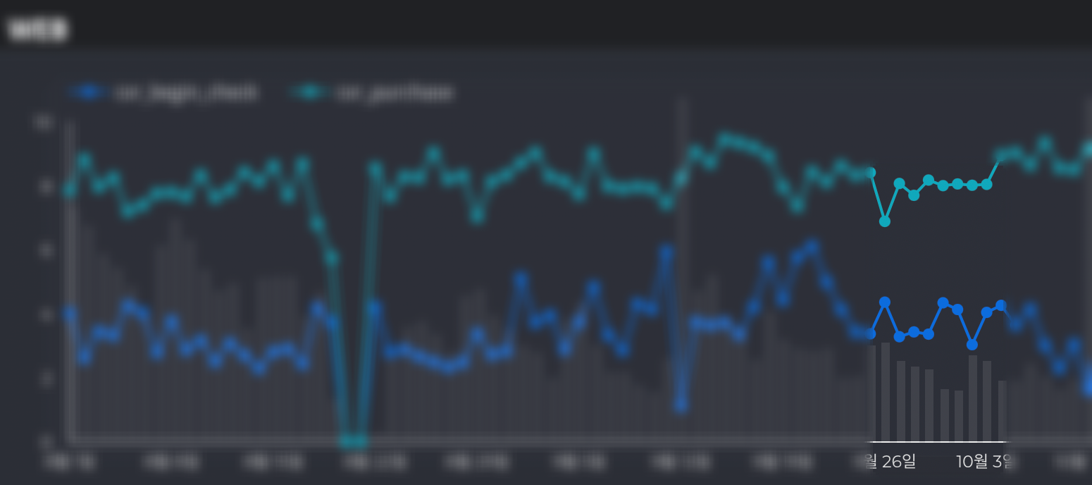 다만 주문서 작성 페이지는 다르다. 파란색이 상품 상세 -> 주문서 작성 의 전환율이고, 바다색이 주문서 작성 -> 실제 결제로 넘어간 고객인데 전일 추이와 견주어 보아도 미세한 변화만 가져올 뿐 특히 개선된 점이 없을 뿐더러 마지막날이 다가오자 파란색 그래프는 아래로 dive했다. 이 dive를 막으려면, 복잡한 고객 여정 단계와 페이지 이동을 간단하게 두고 프로모션을 진행하면 되지 않을까? 라는 생각이 이때쯤부터 시작되었던 것 같다.