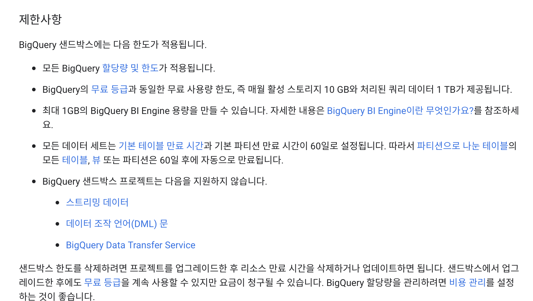기본 빅쿼리 세팅에 의하면 GA4와의 연결은 매우 편리하게 되어있지만, 기본 세팅은 '테이블은 60일 지나면 삭제'이다. 이건 사실 빅쿼리 샌드박스의 정책이며, 신경쓰지 않을 경우 위에서 본 테이블이 계속 events(60)으로 멈추게 되는 현상을 볼 수 있을 것이다.