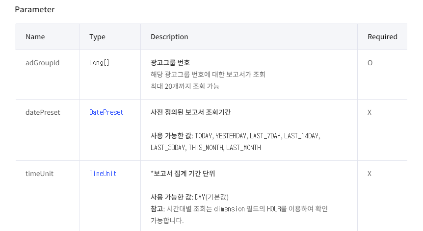 나같은 경우 특정 캠페인 id들이 있고, 그 광고 캠페인의 다양한 유형(ex. 디스플레이 광고 / 플러스 친구 DM 광고) 이 있는데, 그 성과에 맞는 값을 가져와야 해서 성과 지표에 맞게 파라미터의 조정이 필요했었다. 이부분은 카카오 공식 레퍼런스 가이드 문서가 충분히 설명을 잘 해주고 있어서 문서를 보고 삽질을 하면서 원하는 폼을 가져올 수 있도록 고민을 했던 것 같다. 보통 노출 / 클릭 / 비용 / 전환 이 가장 기본적인 지표가 될 것이고 클릭당 비용 같은 단순한 것들을 계산하는 것은 문제가 없다. CPC나 CPM, CPA는 가장 베이직한 지표 중에 하나다.